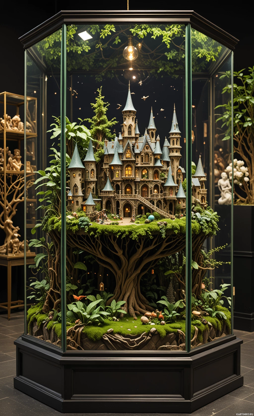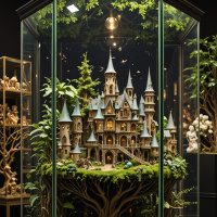 На картинке в центре выделяется дерево с зелёной листвой и коричневым стволом. Оно заключено в подобие стеклянного купола или витрины, что делает его главным акцентом экспозиции. Слева от дерева — миниатюрная копия замка с множеством башен и зубцов, что указывает на масштабный замысел, характерный для таких сооружений. Замок также помещён в свой собственный стеклянный купол или витрину, подобно дереву. Фон экспозиции тёмный, что создаёт резкий контраст и ещё больше подчёркивает зелень и архитектуру в центре.