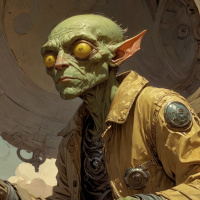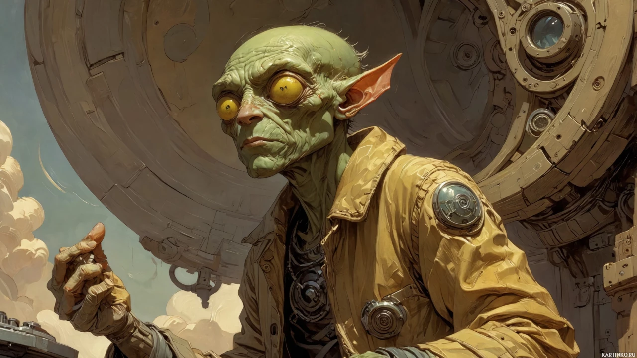 На картинке изображен персонаж, напоминающий смесь гоблина из фэнтези и героя научной фантастики. У него зеленая кожа, заостренные уши, желтые глаза с красными зрачками и поношенная бежевая куртка с подвернутыми рукавами. На заднем плане виден большой металлический шар, намекающий на передовые технологии. Персонаж стоит рядом с космическим кораблем или транспортным средством космической тематики, на фоне инопланетного пейзажа.