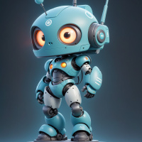 The image depicts a three-dimensional rendering of a robot that resembles a character from science fiction. It has a humanoid form with two arms, a head with eyes and antennae, and a body structure that suggests it could be a companion or assistant type robot commonly found in such narratives. The color palette includes shades of blue and orange accents, giving it an advanced, possibly high-tech appearance. The background is a uniform dark grey, which contrasts with the robot's lighter colors.