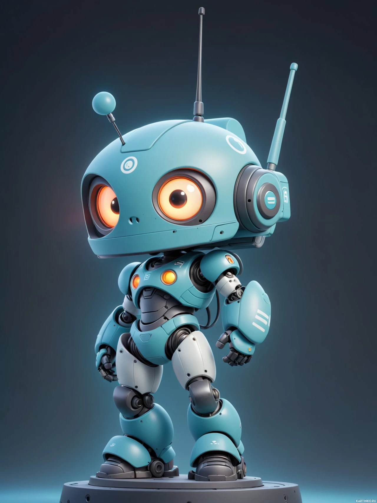 На картинке изображен трехмерный рендер робота, похожего на персонажа из научно-фантастического фильма. У него гуманоидная форма с двумя руками, головой с глазами и антеннами, и конструкция тела, которая намекает на то, что это может быть робот-компаньон или помощник, часто встречающийся в подобных сюжетах. Цветовая палитра включает оттенки синего и оранжевые акценты, что придает ему продвинутый, возможно, высокотехнологичный вид. Фон – однотонный темно-серый, что контрастирует со светлыми цветами робота.