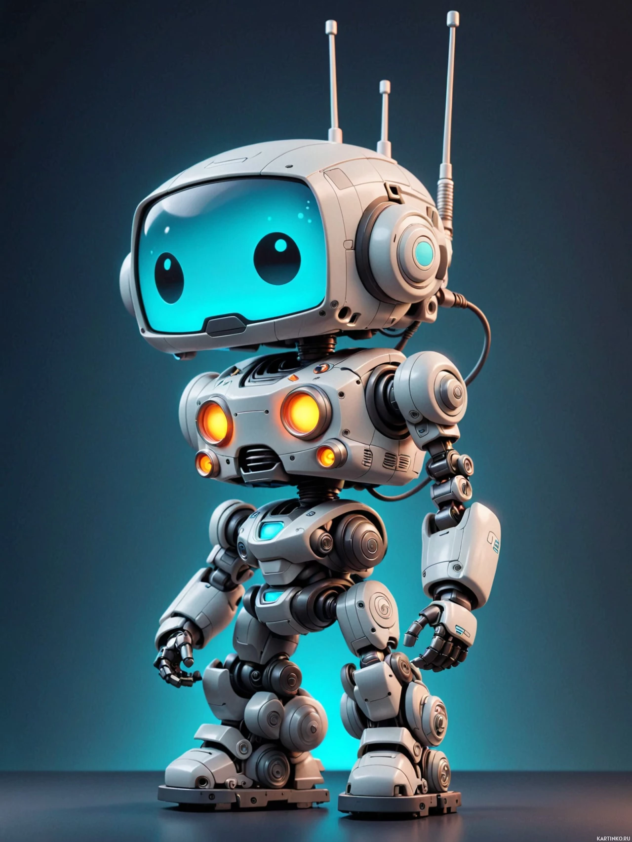 На картинке представлен трехмерный рендер робота, похожего на человека – судя по антропоморфной форме и выразительной мордочке с большими глазами, он создавался для взаимодействия с людьми. Фигура выполнена в человеческой позе: руки слегка отставлены от тела, ноги расставлены, что придает ощущение устойчивости. Поверхность тела напоминает металлические пластины или текстурированную оболочку, а на корпусе и голове видны светящиеся элементы, вероятно, электронные компоненты или сенсоры.