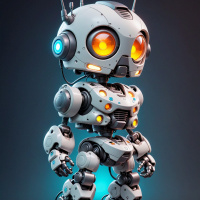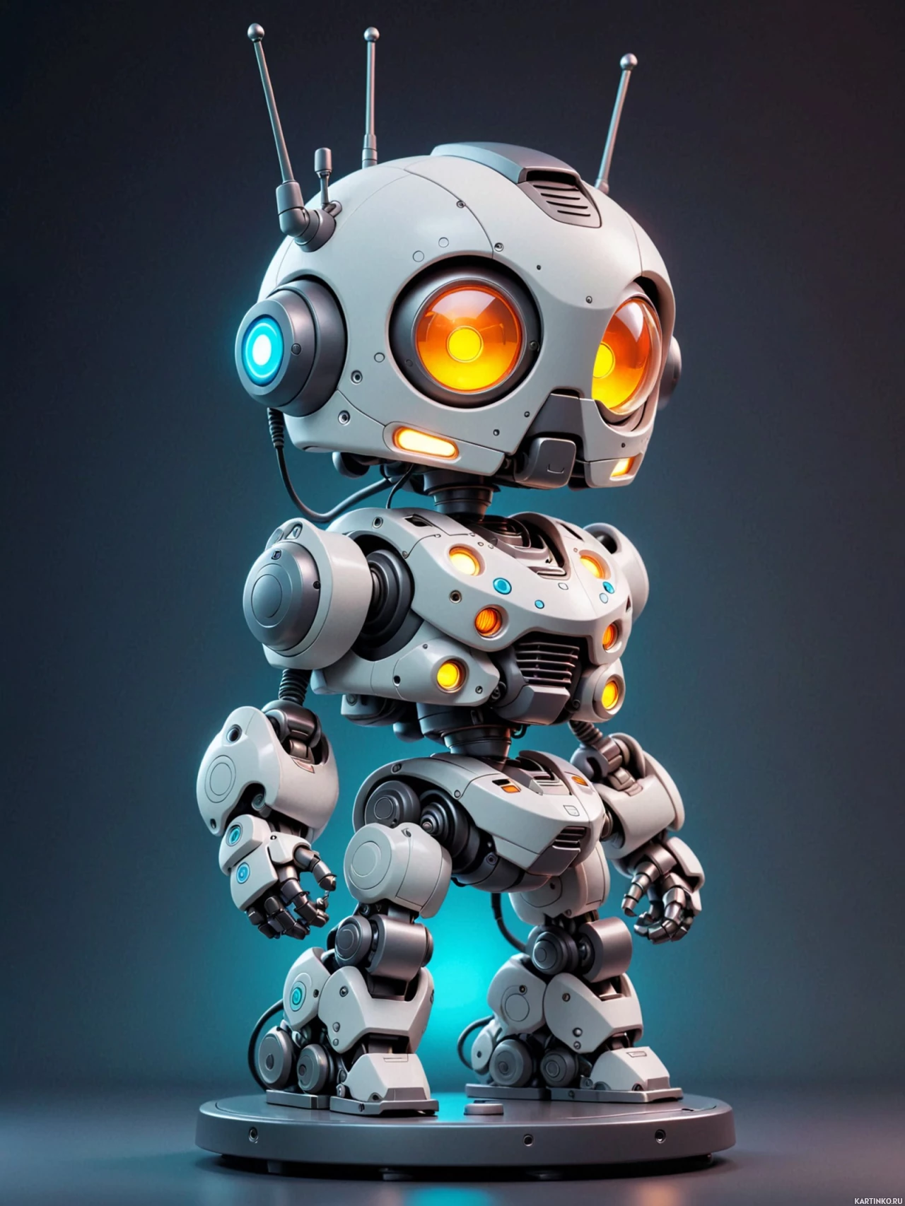 На картинке изображена трехмерная модель робота в стиле научной фантастики. Робот стоит прямо, демонстрируя проработанный дизайн с металлическими элементами, намекающими на передовые технологии. У него гуманоидная форма с шарнирными соединениями в плечах и бедрах, что предполагает возможность совершать движения, похожие на человеческие. На голове – антенны, которые могут использоваться для связи или для сенсорных функций. Тело робота преимущественно серое и белое, с акцентами оранжевого и синего освещения, подчёркивающего отдельные части, возможно, обозначая зоны функционирования или источники энергии. Фон нейтральный и не отвлекает от самого робота. Внимание сосредоточено исключительно на этом персонаже, представленном с высоким уровнем детализации, что позволяет предположить, что он может быть частью более крупного повествования или просто самостоятельной художественной работой.