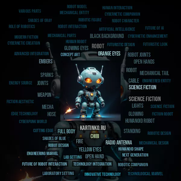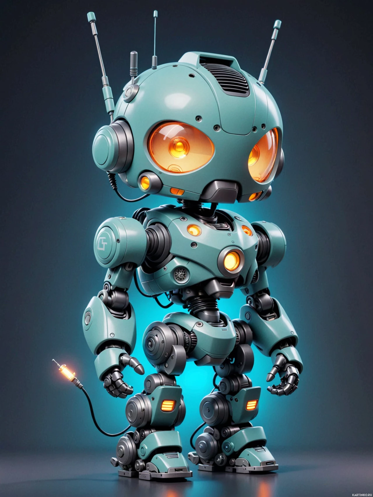 На картинке изображён стилизованный робот с антропоморфными чертами, включая большие выразительные глаза и, кажется, небольшой рот. У него металлический корпус с механическими деталями, такими как шестерёнки и провода. Он стоит на двух ногах и держит в правой руке, похоже, палочку или инструмент. Левая рука робота имеет, кажется, человеческую форму, с локтевым суставом. Оранжевые акценты выделяют глаза, рот и, возможно, внутренние компоненты, создавая яркий контраст с приглушённой цветовой гаммой робота. Фон – тёмный градиент, резко контрастирующий с металлической поверхностью робота.