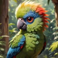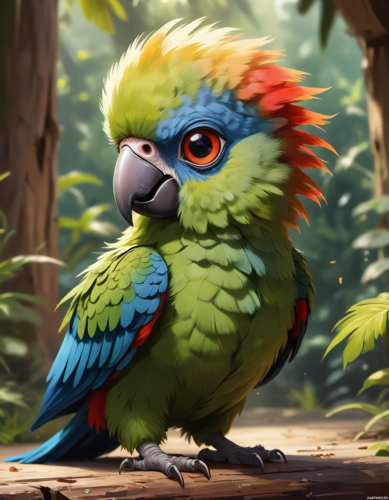 Картинка изображает стилизованное изображение попугая с яркими красками: преимущественно зелёным, синим и красным, с белыми перьями на голове. Птица сидит на скалистой поверхности и, кажется, смотрит в сторону от зрителя. У неё заметный гребень, напоминающий языки пламени. Фон указывает на лесной пейзаж с мягкой фокусировкой, создавая ощущение естественной среды.