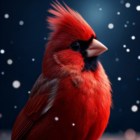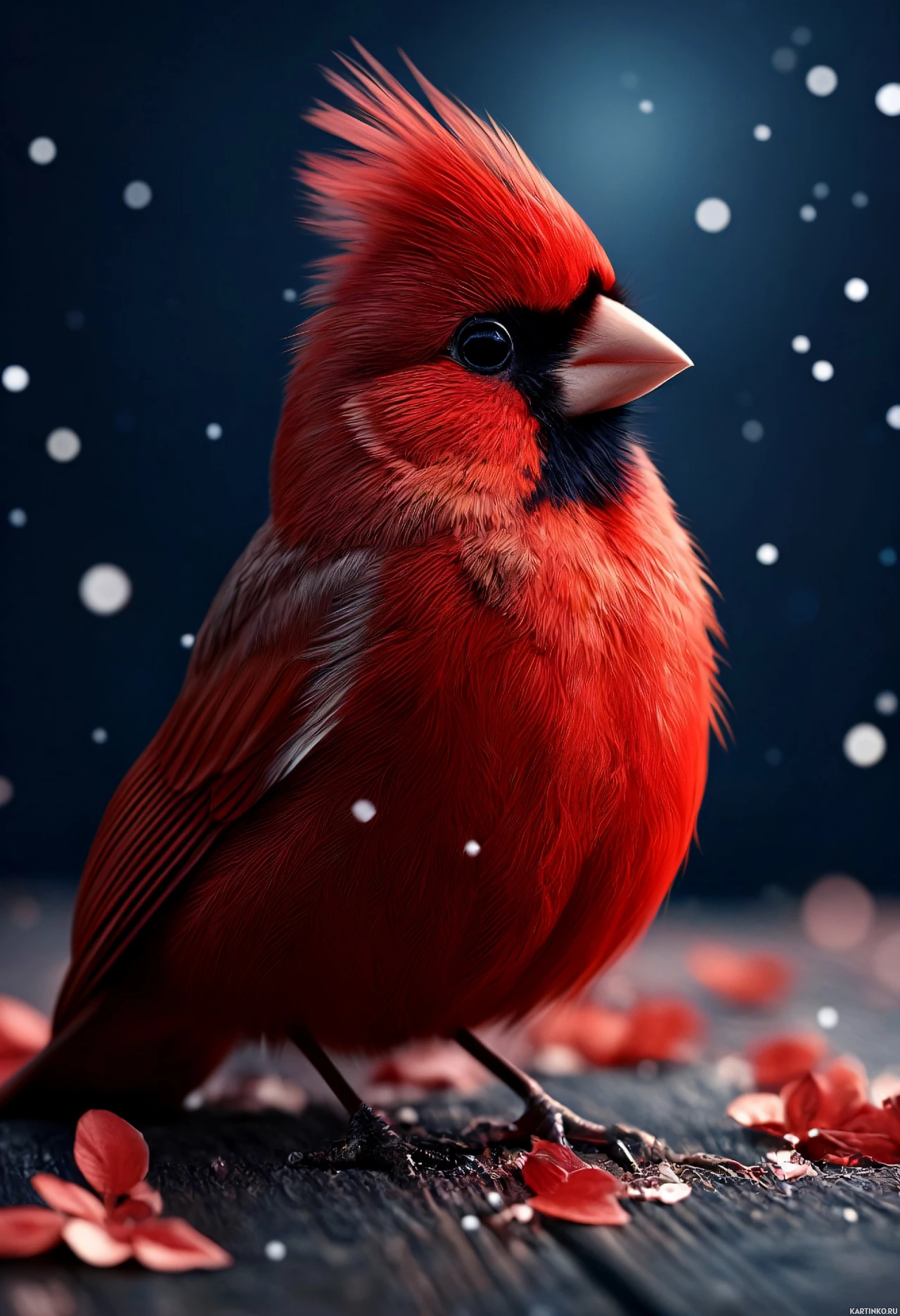 На картинке – ярко-красный кардинал, сидящий на поверхности, усыпанной лепестками красных роз. Птица повернула голову немного влево, и видны белые отметины на крыльях и хвосте. Глаза широко раскрыты, создавая впечатление удивления. Фон затемнён, что резко контрастирует с ярким цветом кардинала и приглушёнными оттенками вокруг. По всей картинке разбросаны маленькие искорки, похожие на снежинки или частицы света.
