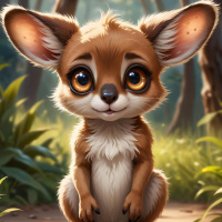 The image depicts a stylized, animated character that resembles a fox with human-like characteristics. The fox has prominent, large ears and large eyes, giving it an endearing appearance. It has fur in shades of brown and white, which suggests a naturalistic style typical for animated characters designed to look like animals. The fox is sitting on a patch of grass with its legs folded under its body, maintaining a small size compared to the surroundings. In the background, there are hints of a forest or jungle setting with trees and light filtering through, creating a serene atmosphere. The overall image conveys a sense of whimsy and fantasy, commonly associated with animated characters.