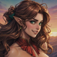 На картинке изображен персонаж, похожий на эльфа: у него заостренные уши и жизнерадостное выражение лица. У него длинные каштановые волосы с зеленой лентой сзади. Он одет в красные доспехи с золотыми деталями, украшенными сложным орнаментом. Фон напоминает закат или восход солнца, небо окрашено в теплые тона, указывающие либо на рассвет, либо на закат.