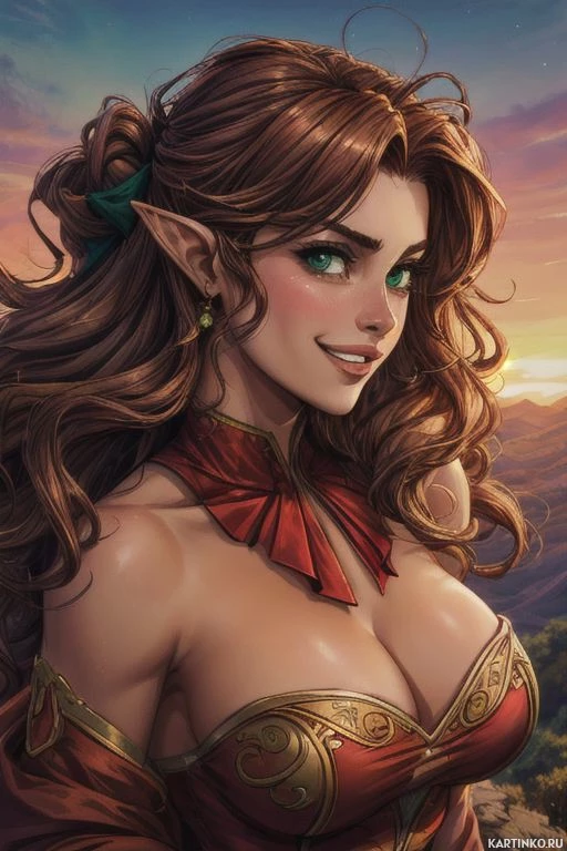 In the image, I see a character that appears to be an elf with pointed ears and a cheerful expression. The character has long brown hair with a green bow at the back. She is wearing red armor with gold accents that are embellished with intricate designs. The background suggests a sunset or sunrise, with warm hues in the sky that might indicate either dawn or dusk.