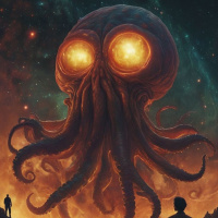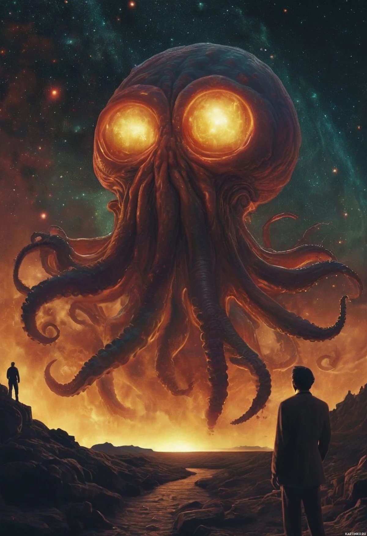 Картинка изображает фантастическую сцену с множеством деталей. На переднем плане – две фигуры: один мужчина, одетый в длинный плащ и шляпу, стоит на краю скалы, спиной к зрителю, а другая фигура не совсем видна. На заднем плане – зловещее небо с облаками, напоминающими светящиеся глаза или черепа, создающими мистическую и жутковатую атмосферу. В центре картинки – большой, тёмно-красный шар, висящий в небе, который можно интерпретировать как планету или луну. От этого шара исходят три ярких, жёлто-оранжевых лучей, напоминающих светящиеся глаза, усиливающих жуткую атмосферу. Под шаром – большое зарево, красное и оранжевое, с пламенем, раздуваемым невидимым ветром или силой. Огонь, кажется, поглощает часть ландшафта; рядом с береговой линией видны камни, что указывает на то, что это может быть прибрежная местность. Общая цветовая палитра доминирует в тёмно-красных, чёрных и оранжевых тонах, с оттенок голубого в небе, который контрастирует с огненным передним планом. Стиль картинки иллюстративный, с акцентом на драматический световой эффект, создающий ощущение тайны и ужаса. Она может ассоциироваться с произведением фэнтези или с художественным творением, призванным вызвать такие эмоции, как благоговение или страх.
