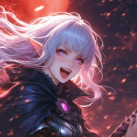 На картинке изображена героиня в стиле фэнтези с белыми волосами. Её внешность напоминает эльфийку, с заостренными ушами и темным плащом, похожим на крылья летучей мыши, что придает ей мистический вид. На заднем плане – багровое небо с плавающими частицами, усиливающими волшебную атмосферу. В верхнем левом углу виден полный месяц, создающий ночную обстановку. В руках героини – трость или волшебная палочка. Её выражение лица напряженное и сосредоточенное, что может говорить о подготовке к важному событию или ритуалу.