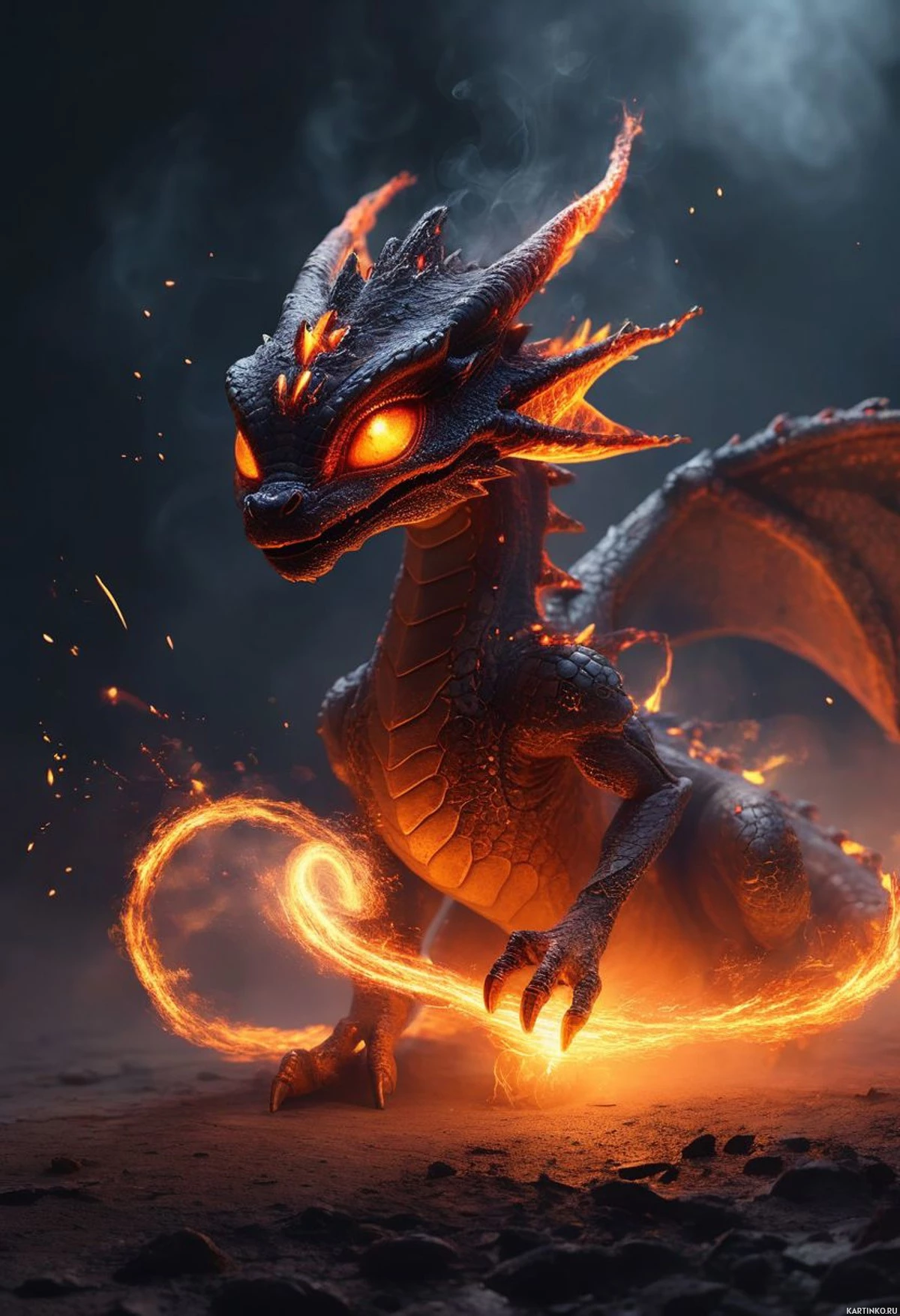 Картинка изображает фантастическую сцену с центральной фигурой, напоминающей дракона. Это существо имеет тело четвероногого зверя, похожего на ящера или рептилии, с выступающими шипами вдоль спины и шеи, как это обычно представляют в мифических или вымышленных драконах. У него есть крылья, и он выдыхает пламя из ноздрей, светящихся красным и жёлтым, что говорит об умении извергать огонь. Фон тёмный, с намёками на магму или расплавленные материалы, вырывающиеся из-под земли слева от существа, что усиливает огненную тематику картинки. Выражение лица существа угрожающее, рот приоткрыт, что может быть интерпретировано как агрессивная поза. Общее впечатление – фантастика и, возможно, опасность.