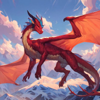 The image features a fantasy depiction of a dragon. The dragon has wings and a tail, with scales in shades of red and blue. It stands on its hind legs atop a mountainous landscape that suggests a cold or snowy environment, indicated by the presence of what appears to be ice or frost around the base of the mountains. There is a sky background with clouds, suggesting either dawn or dusk due to the soft lighting and long shadows. The style of the image is characteristic of digital art often associated with fantasy genres in literature or media.
