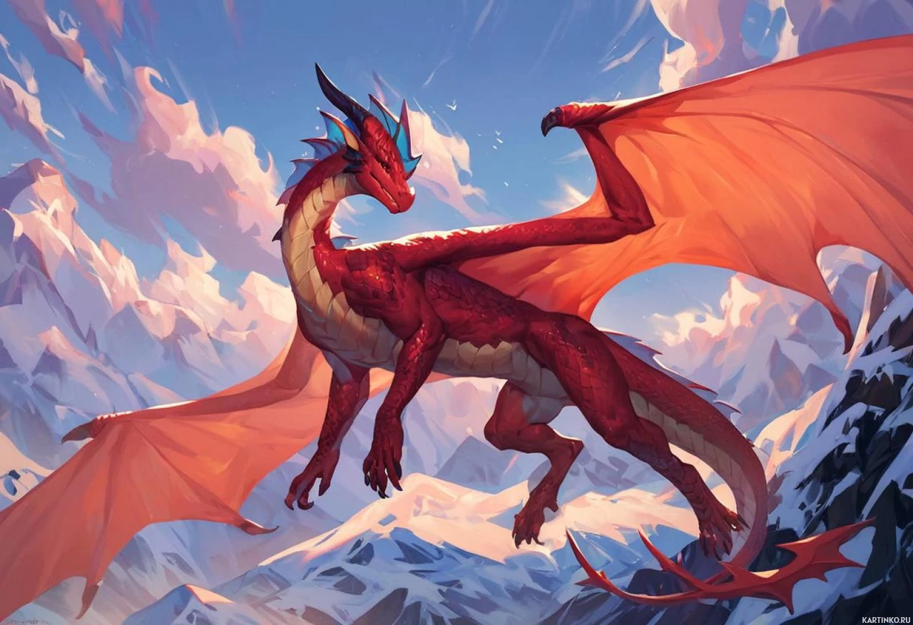 На картинке изображен фантастический дракон. У него есть крылья и хвост, чешуя переливается оттенками красного и синего. Он стоит на задних лапах на вершине горного пейзажа, который намекает на холодную или снежную местность – об этом говорят признаки льда или инея у подножия гор. На заднем плане – небо с облаками, создающее ощущение либо рассвета, либо заката благодаря мягкому освещению и длинным теням. Стиль картинки характерен для цифрового искусства, часто используемого в фэнтезийных произведениях литературы или медиа.