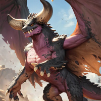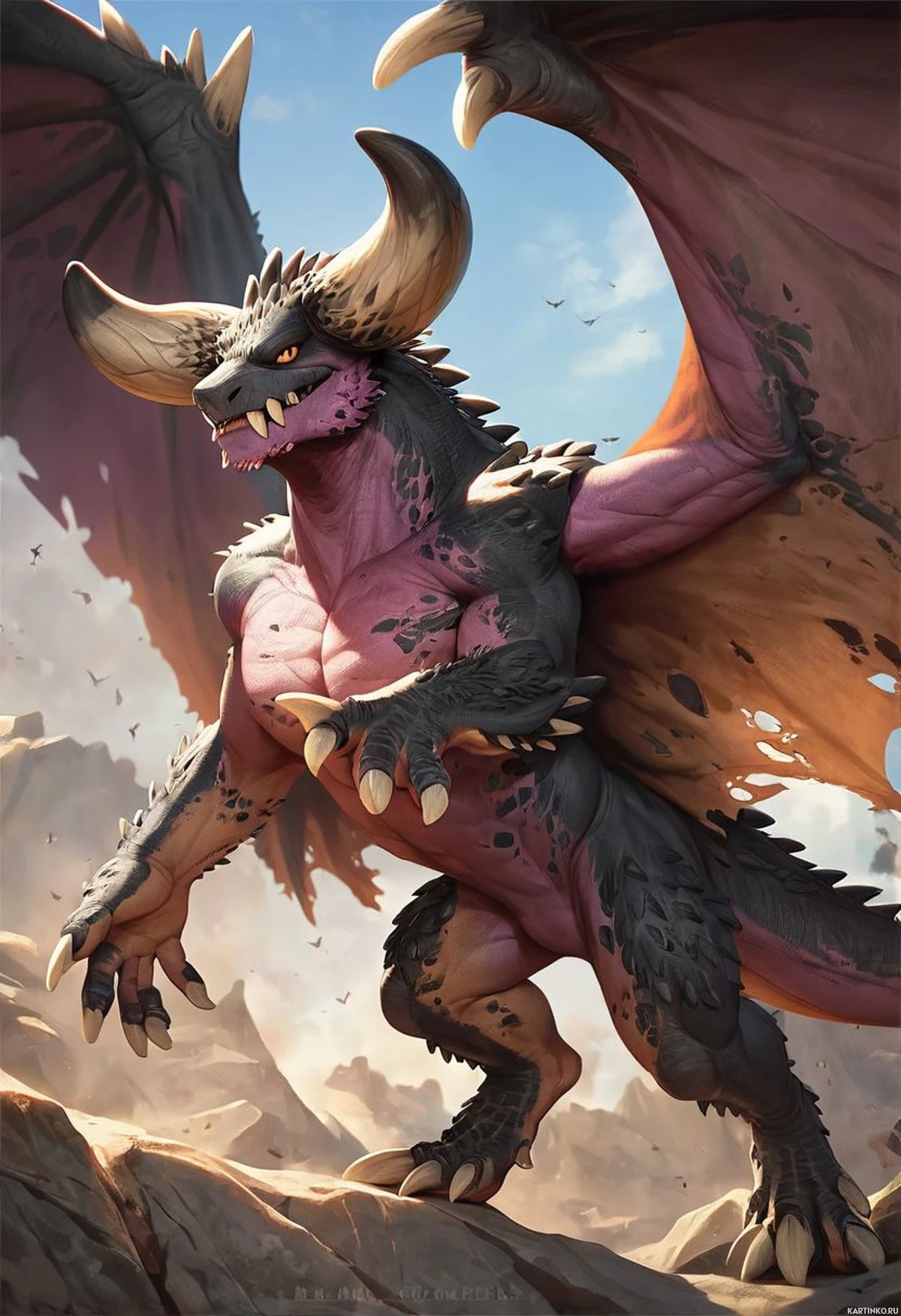 На картинке изображено фэнтезийное существо, похожее на дракона, стоящее на каменистой местности. На фоне – чистое небо. У дракона фиолетово-чёрная чешуя, большие рога, изогнутые дугой над головой, и острые зубы, заметные, когда он рычит или скалит пасть. У него также есть крылья и хвост, придающие ему сказочный вид. Верхняя часть тела существа мускулистая и напоминает человеческое тело, с широкими плечами и развитой грудью. Стиль рисунка – детализированный и яркий, свойственный фэнтези-арту, часто встречающемуся в видеоиграх или иллюстрациях для книг, действие которых разворачивается в вымышленных мирах.