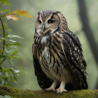 На картинке – сова, сидящая на ветке в, кажется, лесистой местности, окутанной зеленью и туманной дымкой. У птицы коричневое оперение, покрытое белыми отметинами – характерная черта этого вида, который обычно называют домовой совой из-за его широкого распространения. Голова совы слегка повернута в сторону, и она кажется настороженной, возможно, смотрит на что-то вдалеке. Глаза широко открыты, взгляд сосредоточен.