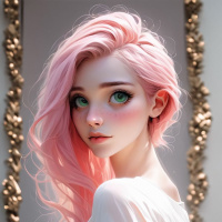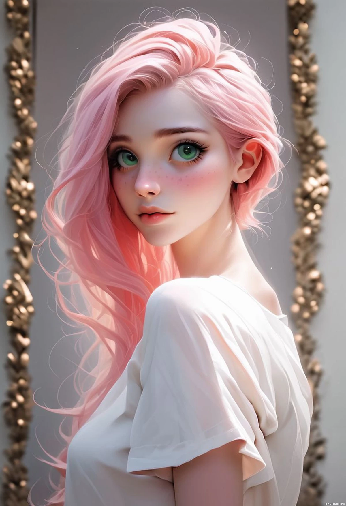 На картинке изображена молодая женщина с розовыми волосами, уложенными в свободные кудри. У неё макияж, включая подводку для глаз и, кажется, натуральный оттенок губ. Её кожа светлая, а выражение лица нейтральное. На ней лёгкий, возможно, кремового или бежевого цвета, топ с воланами на рукавах. Кажется, действие происходит в помещении, где зеркала отражают часть её изображения и, вероятно, светильники на заднем плане. Она смотрит прямо в камеру, что создаёт впечатление формального или постановочного снимка.