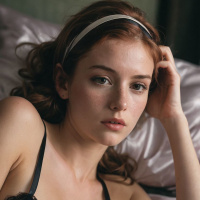 На картинке женщина лежит на кровати с розовыми простынями. На ней кружевной бюстгальтер с цветочным принтом, а волосы уложены в мягкие волны, ниспадающие на плечи. Голова повернута в сторону от камеры, на лице – спокойное выражение. Свет приглушенный, картинка создает ощущение интимности.