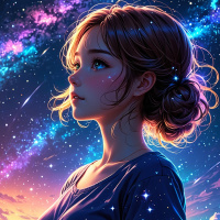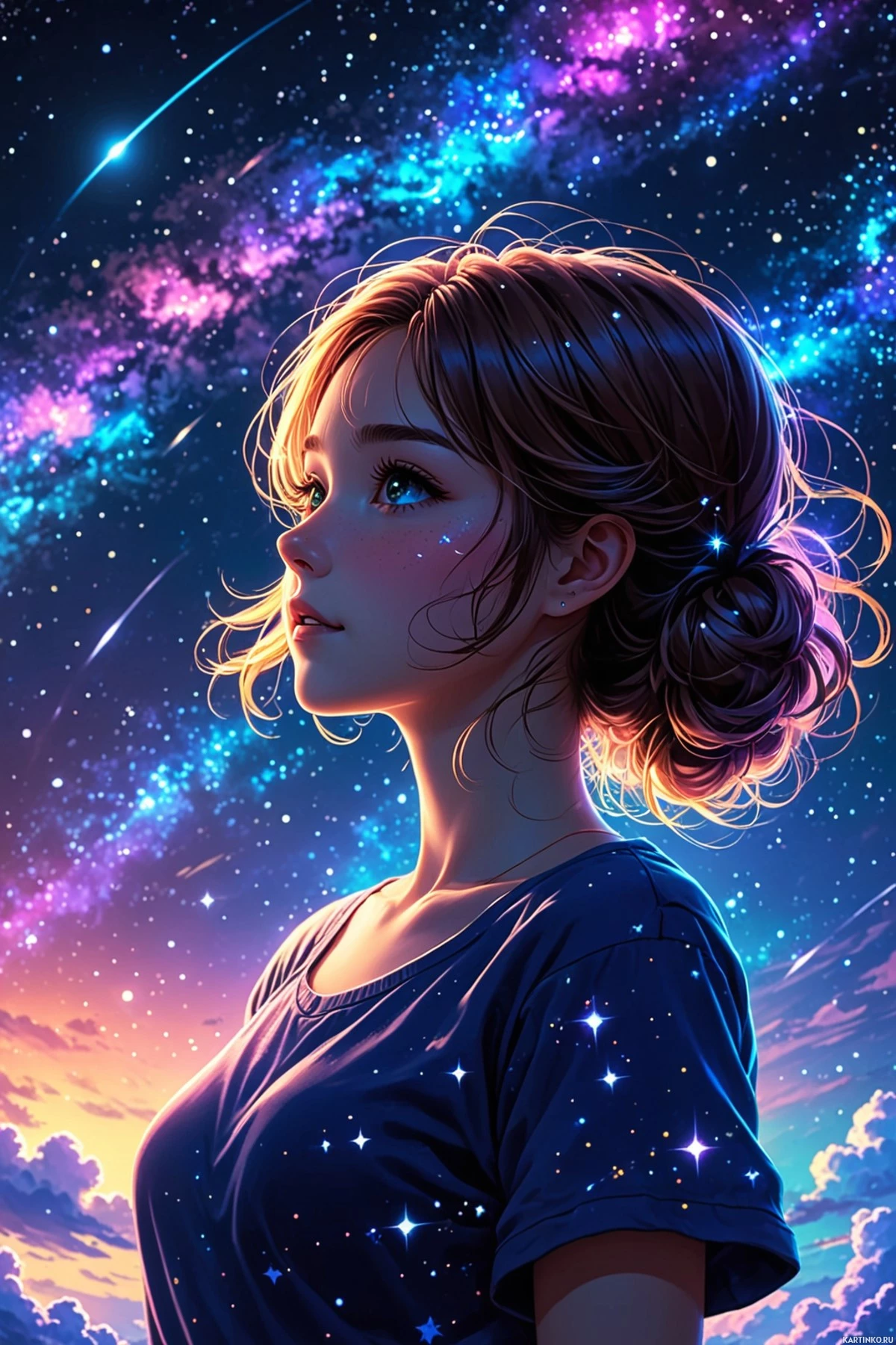 fair skin and her eyes are looking upwards towards the sky, which is depicted as a rich tapestry of stars against a vibrant nebula. Her lips are slightly parted as if she's in