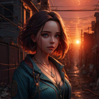 the warm lighting and the low angle of the setting sun visible above. She is dressed in a denim jacket with multiple layers, worn over