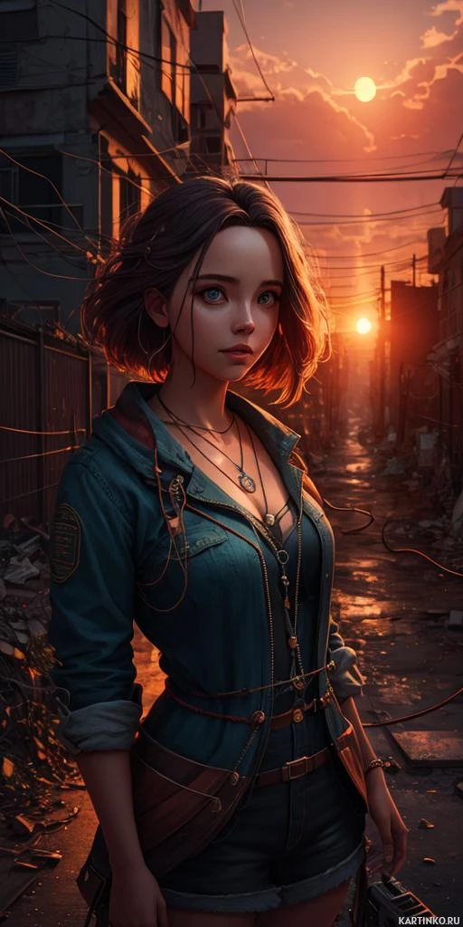 a female character with red hair. She is depicted in a stylized illustration, giving her an animated appearance. The character is standing on what appears to be a cobblestone street or alley at sunset or during dusk, as suggested by