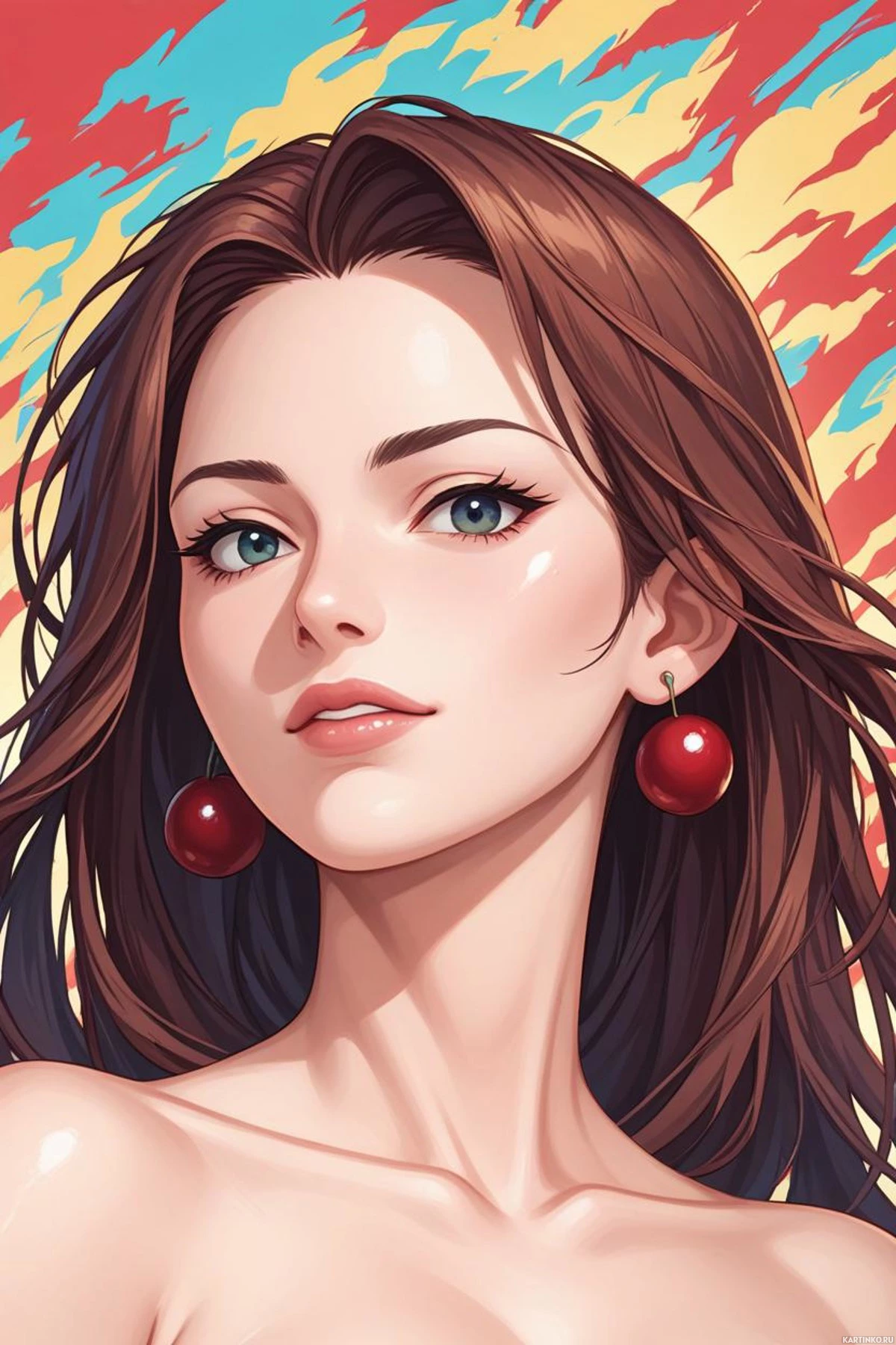 На картинке – стилизованный портрет девушки, выполненный в ярких тонах и в технике цифровой живописи. У неё длинные каштановые волосы, голубые глаза и большие серьги, похожие на красные плоды, возможно, яблоки или персики. Макияж включает чётко очерченные брови, подводку для глаз и губы, покрытые глянцевой помадой светло-розового оттенка. Фон – градиент от жёлтого к синему с абстрактными формами, которые усиливают общее стилизованное впечатление.