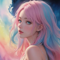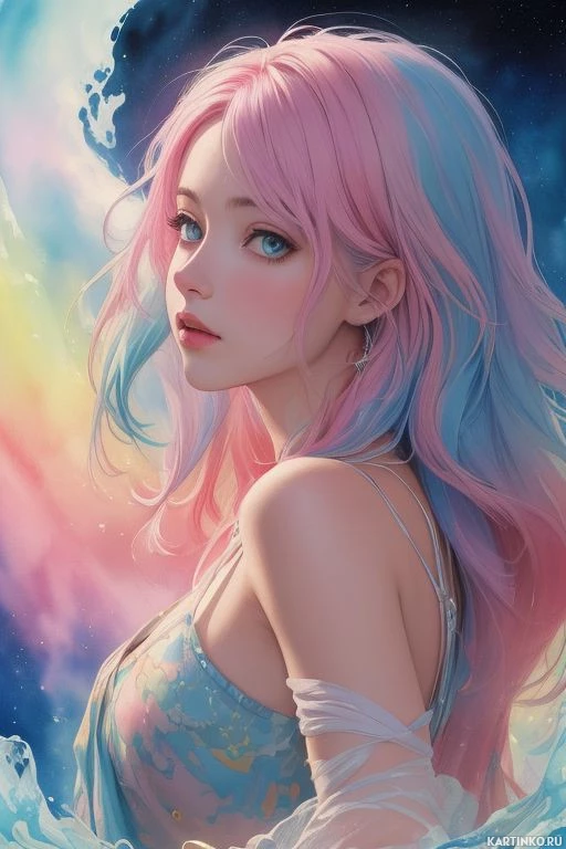The image features a stylized illustration of a girl with distinctive pink and blue hair, styled in an artistic manner that adds to her fantastical appearance. She has striking blue eyes and is wearing a dress that seems to be floating or emerging from the colors of the background, which transitions through various shades of the rainbow spectrum. The girl is looking directly at the viewer with a subtle expression on her face.