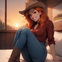 На картинке запечатлена женщина, сидящая на кровати на закате. У неё длинные рыжие волосы, на голове – ковбойская шляпа, она одета в джинсовую рубашку и джинсы с ботинками. Её поза расслабленная, она улыбается смотрящему. Кажется, действие происходит в доме или в деревенском интерьере с деревянными стенами, а свет заката пробивается сквозь окно за её спиной, создавая тёплую атмосферу.