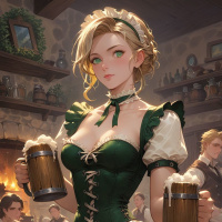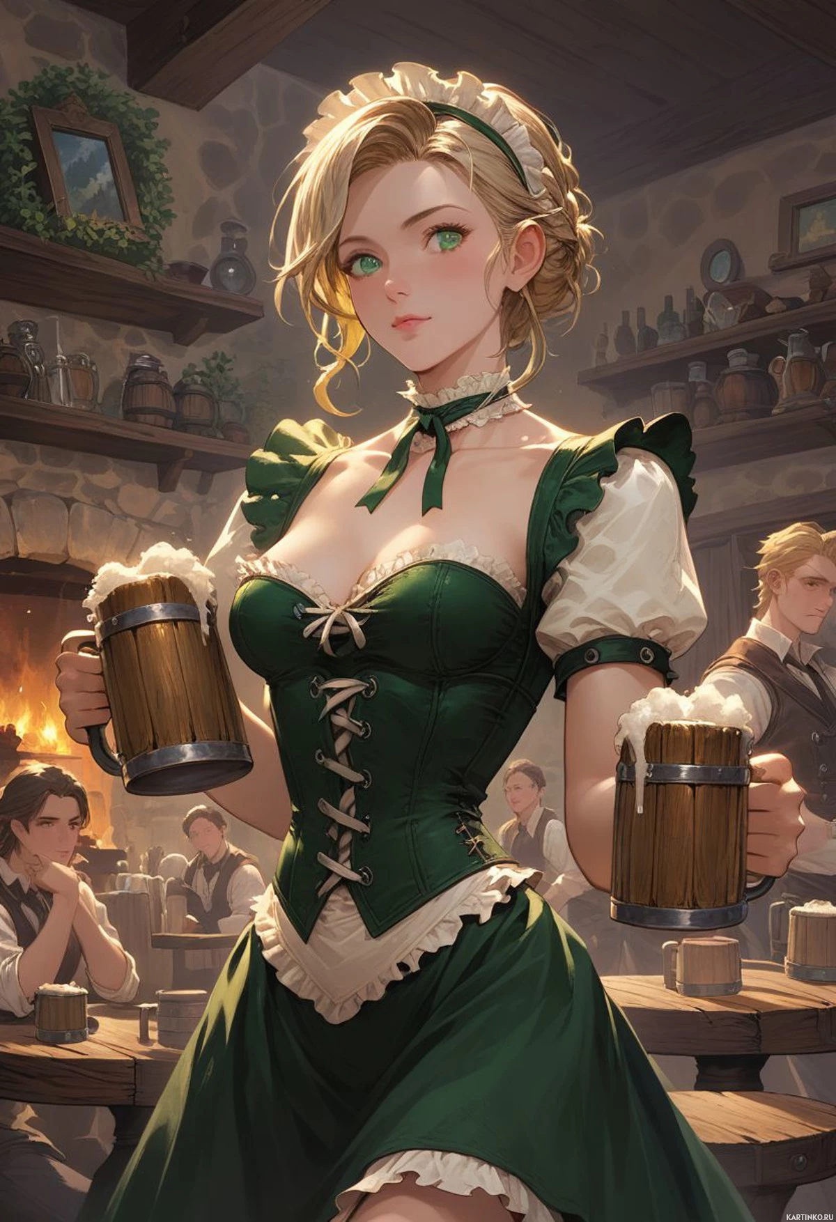 Картинка изображает персонажа, девушку с светлыми волосами, выполненную в мультяшном стиле. На ней средневековый наряд: зеленое платье с воланами и корсет. В руках она держит два больших кружки, наполненных пенным напитком, вероятно, пивом или чем-то подобным. Выражение лица говорит о сосредоточенности или, возможно, удовольствии. На заднем плане – интерьер, напоминающий трактир или паб. Видны другие персонажи: официантка и посетители, сидящие у стойки. Освещение и детали создают теплую, гостеприимную атмосферу, характерную для подобных заведений.