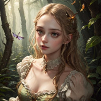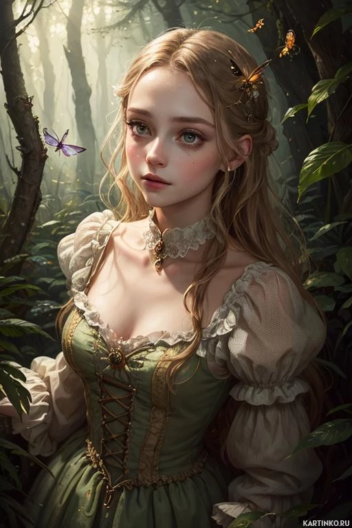 shades of green and gold, with visible embroidery and lace details. There are also elements suggesting a fantasy or fairy tale theme, such as the presence of a butterfly near her shoulder. The character is standing amidst what seems to be a lush