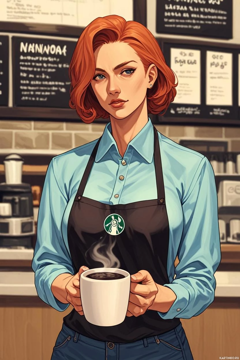 На картинке запечатлена женщина с яркими рыжими волосами, сделавшая перерыв во время работы в кофейне. На ней профессиональный чёрный фартук поверх голубой рубашки и джинсов, что позволяет предположить, что она сотрудник или владелица заведения. За её спиной – барная стойка с кофейным оборудованием. На ней несколько чашек и кофемашина, готовые к работе.