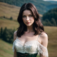 На картинке изображена женщина, стоящая на открытом воздухе, на фоне зеленого поля и холмов, что создает ощущение сельской местности или природного ландшафта. На ней исторический костюм, включающий корсет и юбку, характерный для прошлых эпох. У неё длинные волнистые волосы, и она, кажется, смотрит в сторону с невыраженным лицом. Картинка цветная и выполнена в портретном формате.