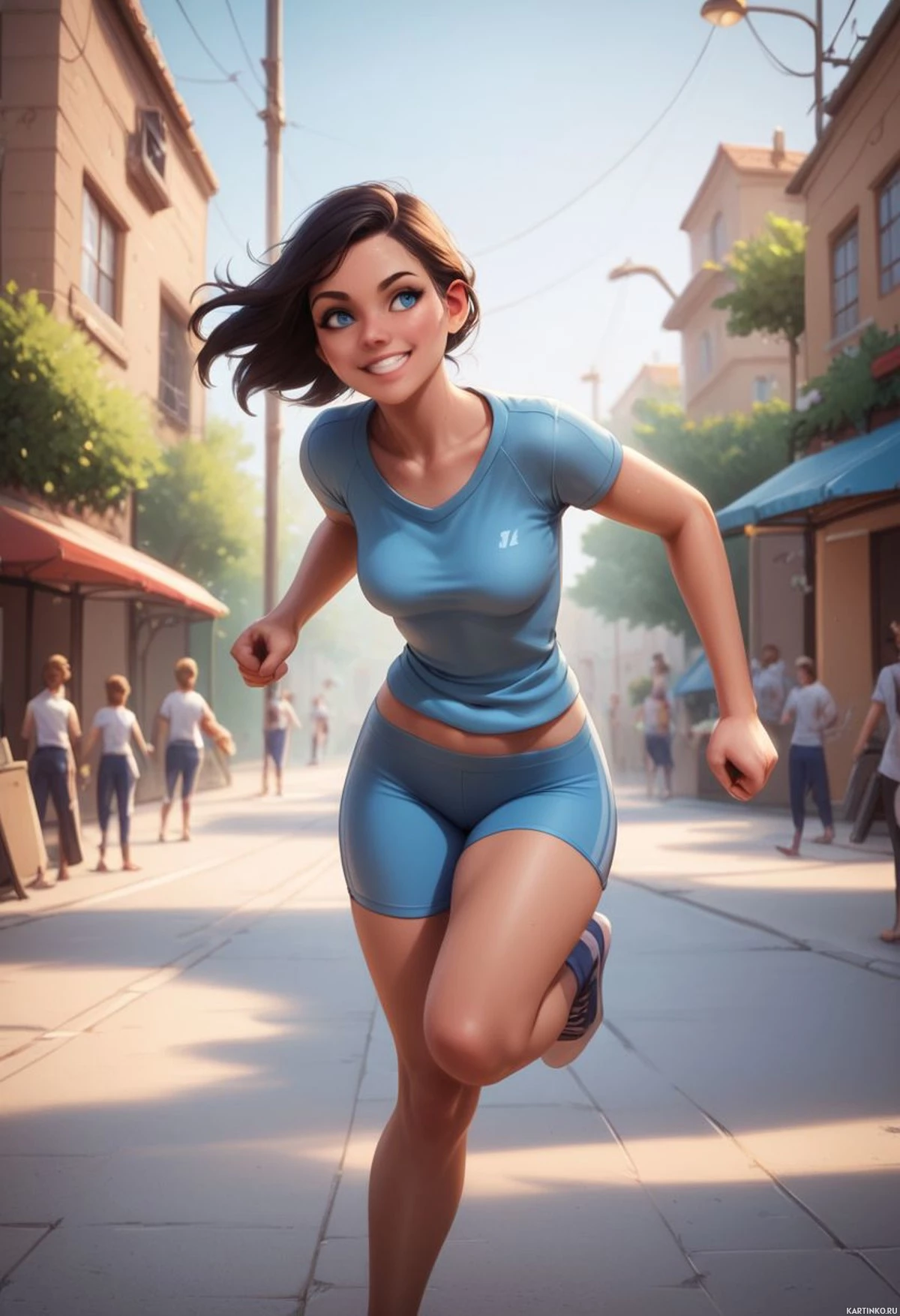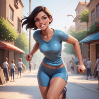 На картинке запечатлена молодая женщина, бегущая по мощёной улице, с обеих сторон которой выстроились магазины и здания. На ней топ без рукавов и шорты, что говорит о том, что она, вероятно, занимается спортом или просто бежит для удовольствия. У неё тёмные волосы до плеч, и она смотрит вправо, не в камеру. На её лице сияет улыбка, добавляющая бегу весёлости и энергии. Освещение на картинке естественное, что говорит о дневном времени суток, и солнечные лучи отбрасывают тени на улицу.