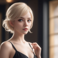 Молодая женщина со светлыми волосами стоит в темной комнате. На ней черное платье без рукавов, а руки слегка приподняты к груди. У нее нейтральное выражение лица, и она смотрит прямо в камеру.