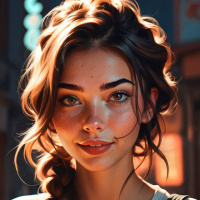 The image displays a digital illustration of a female character. She has brown hair styled into braids and her skin appears to be tanned. Her expression is warm with a slight smile, and she is looking directly at the viewer. She has detailed facial features such as eyebrows and eyes, which are blue in color. The background suggests an urban setting, possibly a street or alleyway, with dim lighting that could indicate either early morning or late evening.