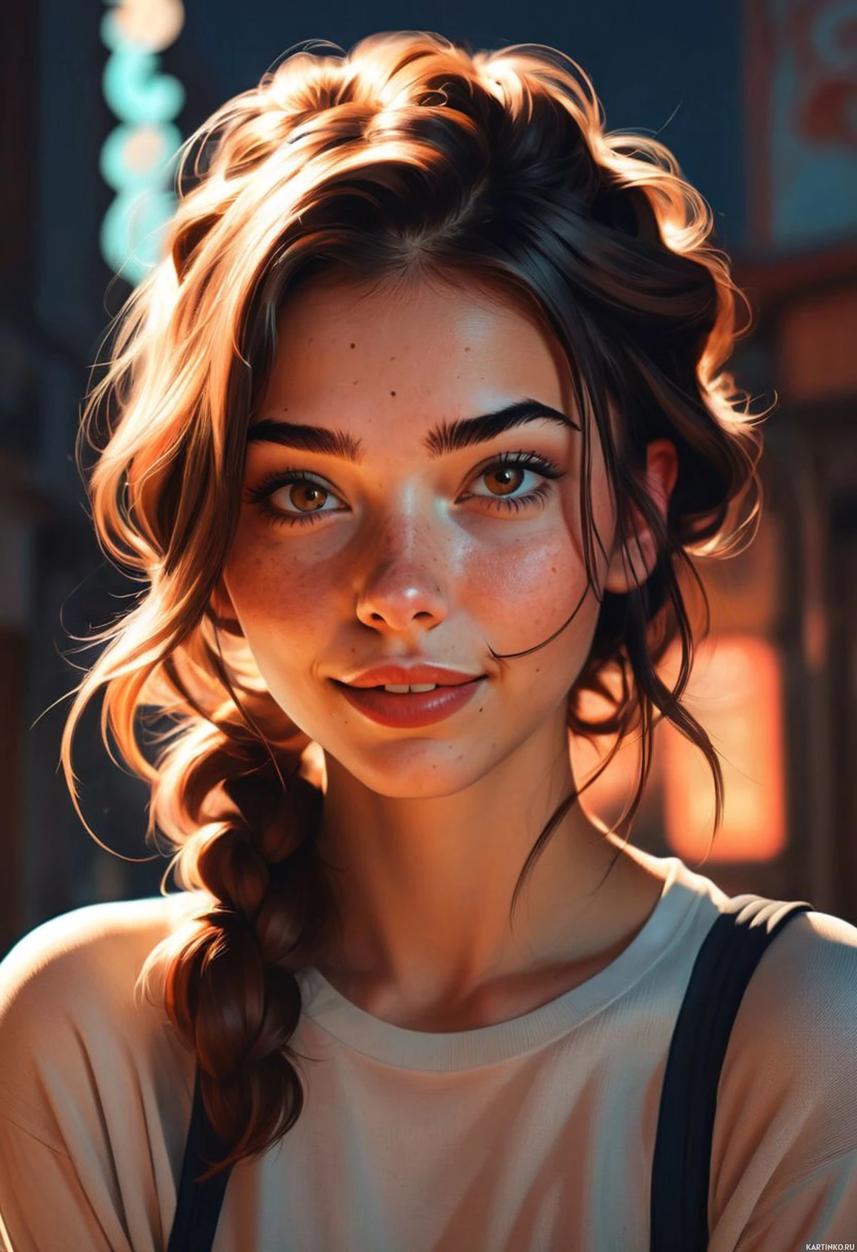 На картинке — цифровая иллюстрация девушки. У неё каштановые волосы, заплетённые в косы, и загорелая кожа. На её лице тёплое выражение, лёгкая улыбка, и она смотрит прямо на зрителя. У неё проработанные черты лица, такие как брови и глаза голубого цвета. Фон намекает на городскую среду, возможно, улицу или переулок, с приглушённым освещением, которое может указывать либо на раннее утро, либо на поздний вечер.