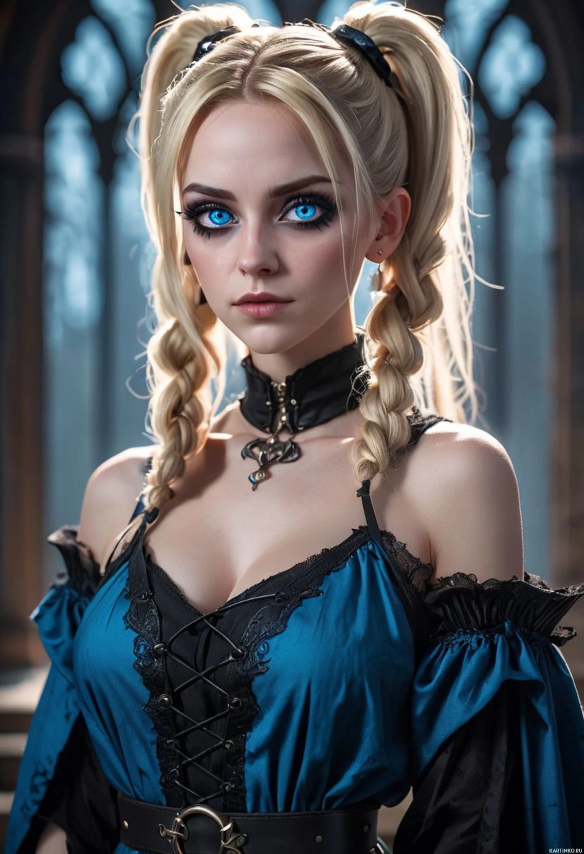 На картинке изображена женщина в костюме в стиле фэнтези. У нее длинные светлые волосы, заплетенные в косы, выразительная линия подбородка, и она одета в темно-синий корсет с замысловатой отделкой. Макияж у нее яркий, с акцентом на глаза и бледной кожей. На заднем плане – полумрачный интерьер с архитектурными элементами, отсылающими к историческому или готическому стилю.