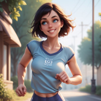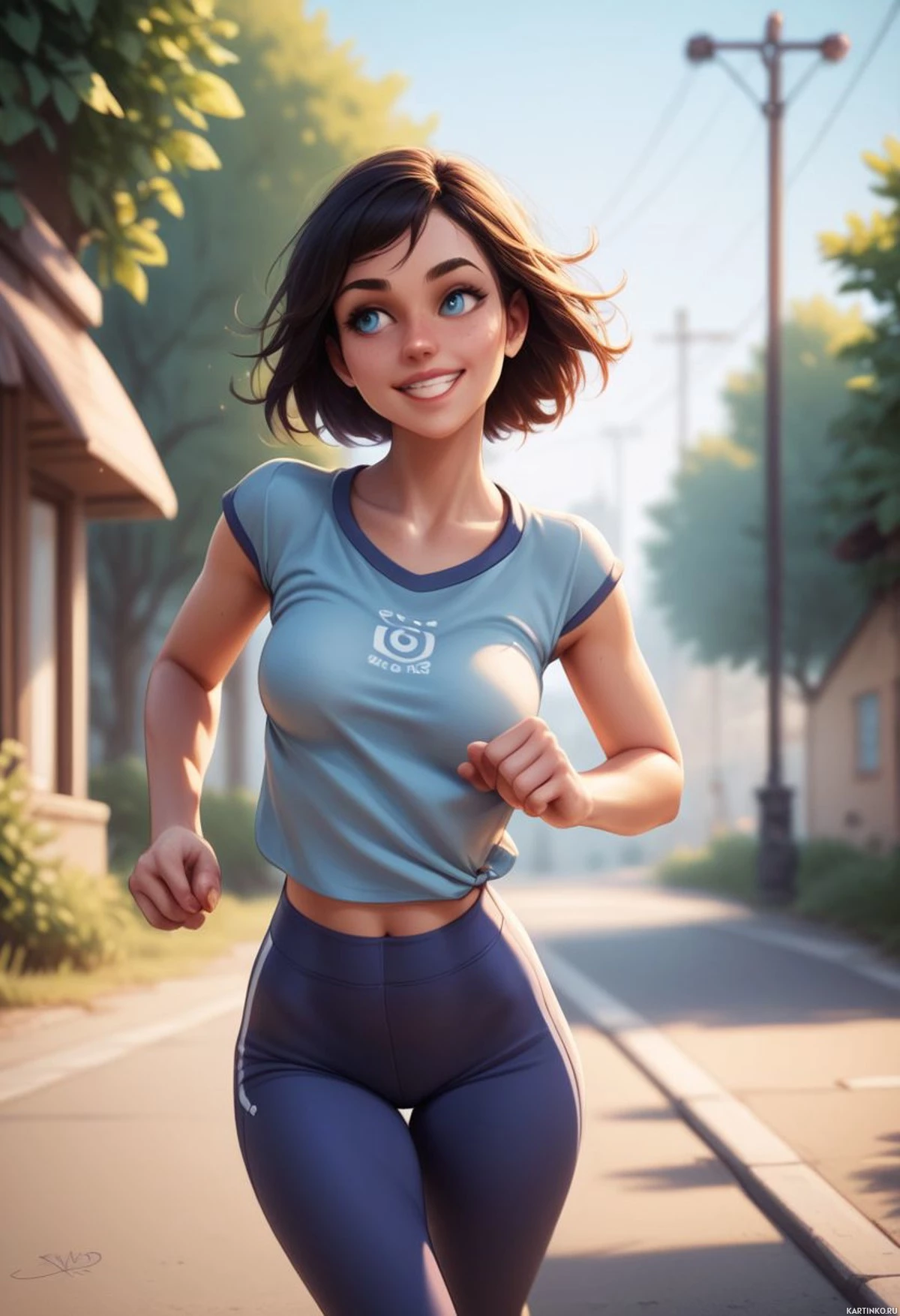 The image features a young woman in motion. She has shoulder-length brown hair and a radiant smile on her face, looking to the side rather than directly at the viewer. She is wearing a light grey athletic top paired with black leggings. The setting appears to be an urban environment; there are trees lining the street, cars parked along the side of the road, and a building in the background that features a clock tower. The overall atmosphere is one of casual activity during daylight hours.