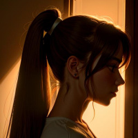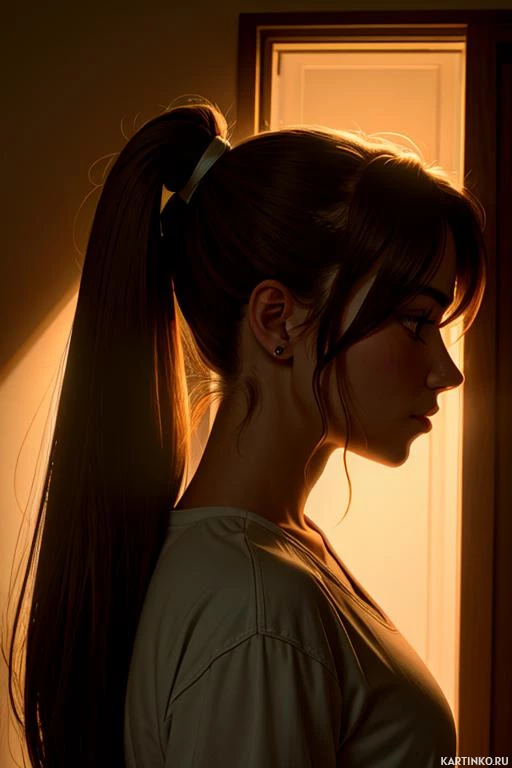 brown hair tied back with a white headband. Her expression is contemplative as she gazes off to the side, away from the viewer, and her lips are slightly parted in