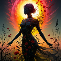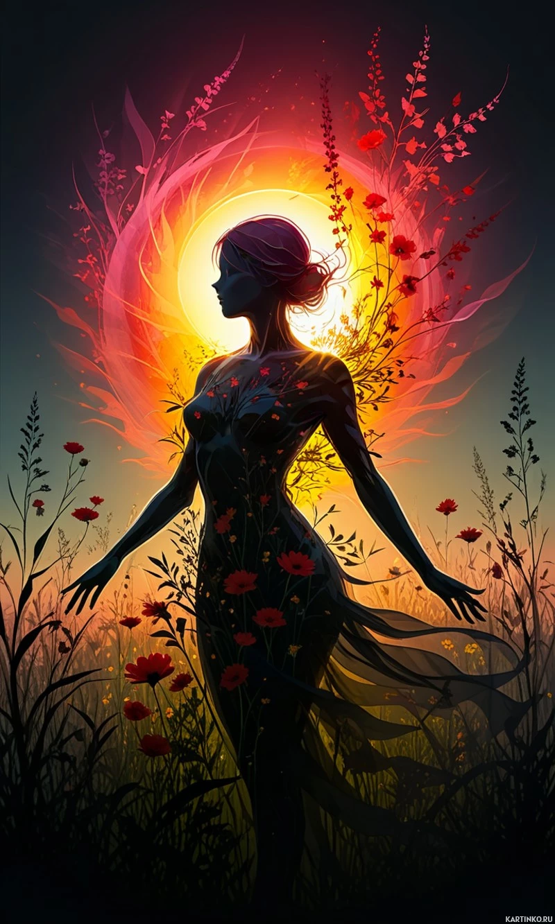 purple hair. She has a silhouette and is standing on what seems to be a platform of petals or leaves, which could suggest an ethereal or otherworldly setting. The background features a fiery sun-like emanation at