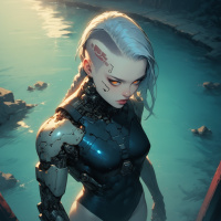 In the image, a female character with white hair is depicted. She is wearing a black bodysuit with metallic accents and has mechanical parts visible on her arms and shoulders, suggesting a science fiction theme. The character stands in a pool of water that fills up to her chest. Surrounding the pool are stone walls and scattered rocks, creating an environment reminiscent of a natural yet stylized setting. The overall tone of the image is one of intense focus or contemplation on the part of the character.