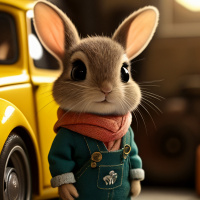 На картинке стоит маленький кролик перед старинным жёлтым автомобилем. У кролика большие уши, на нём голубая куртка с капюшоном и зелёный комбинезон. Вокруг шеи – коричневый шарф. Кажется, он смотрит прямо в камеру, с немного удивлённым выражением лица. Судя по машине и инструментам на заднем плане, действие происходит в гараже или мастерской.