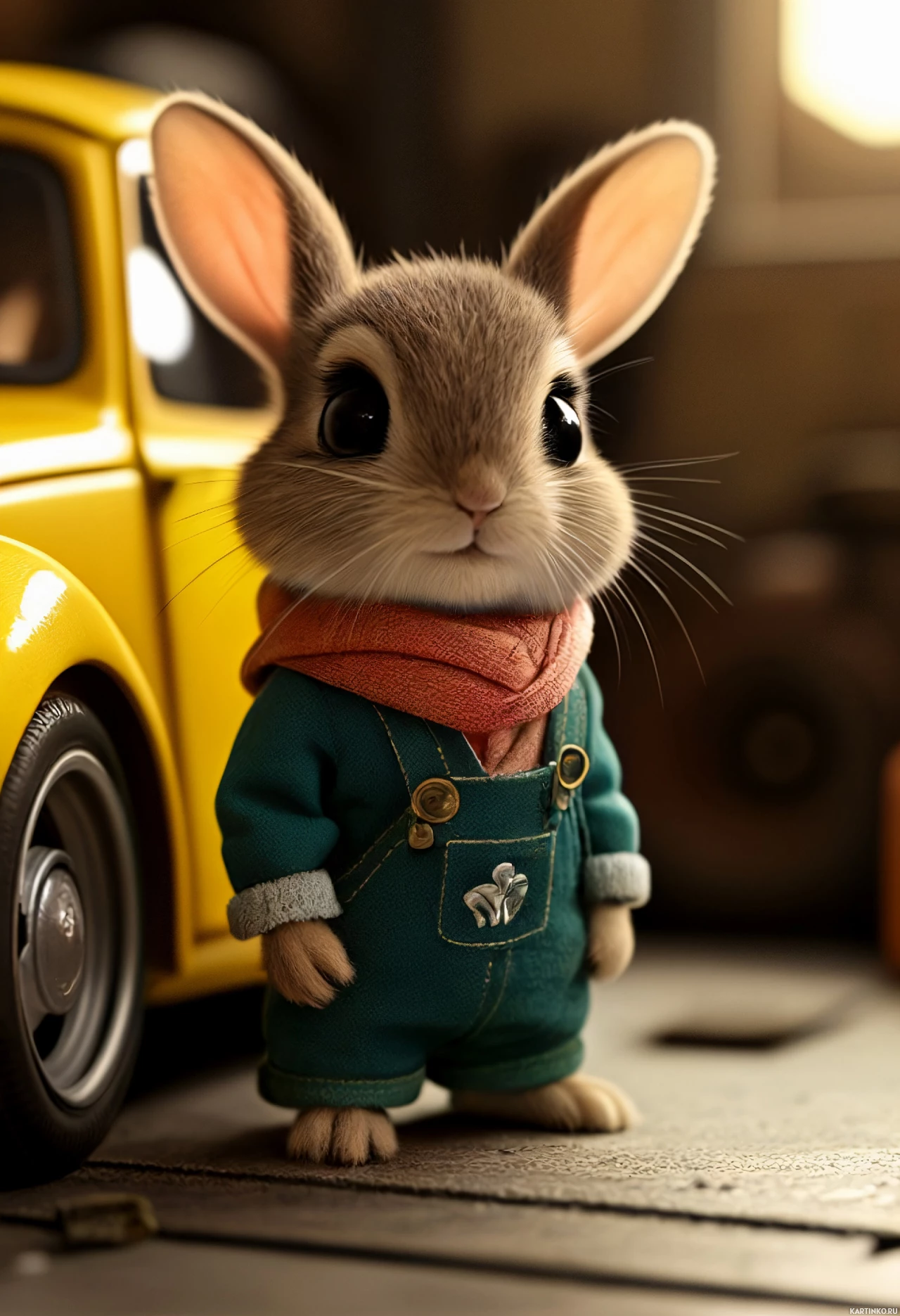 In the image, there's a small rabbit standing in front of a vintage yellow car. The rabbit has large ears and is wearing a blue coat with a hood. It also has on green overalls. There's a brown scarf around its neck. The rabbit appears to be looking directly at the camera, giving it a somewhat surprised expression. The setting seems to be an indoor garage or workshop area, as evidenced by the car and some tools visible in the background.
