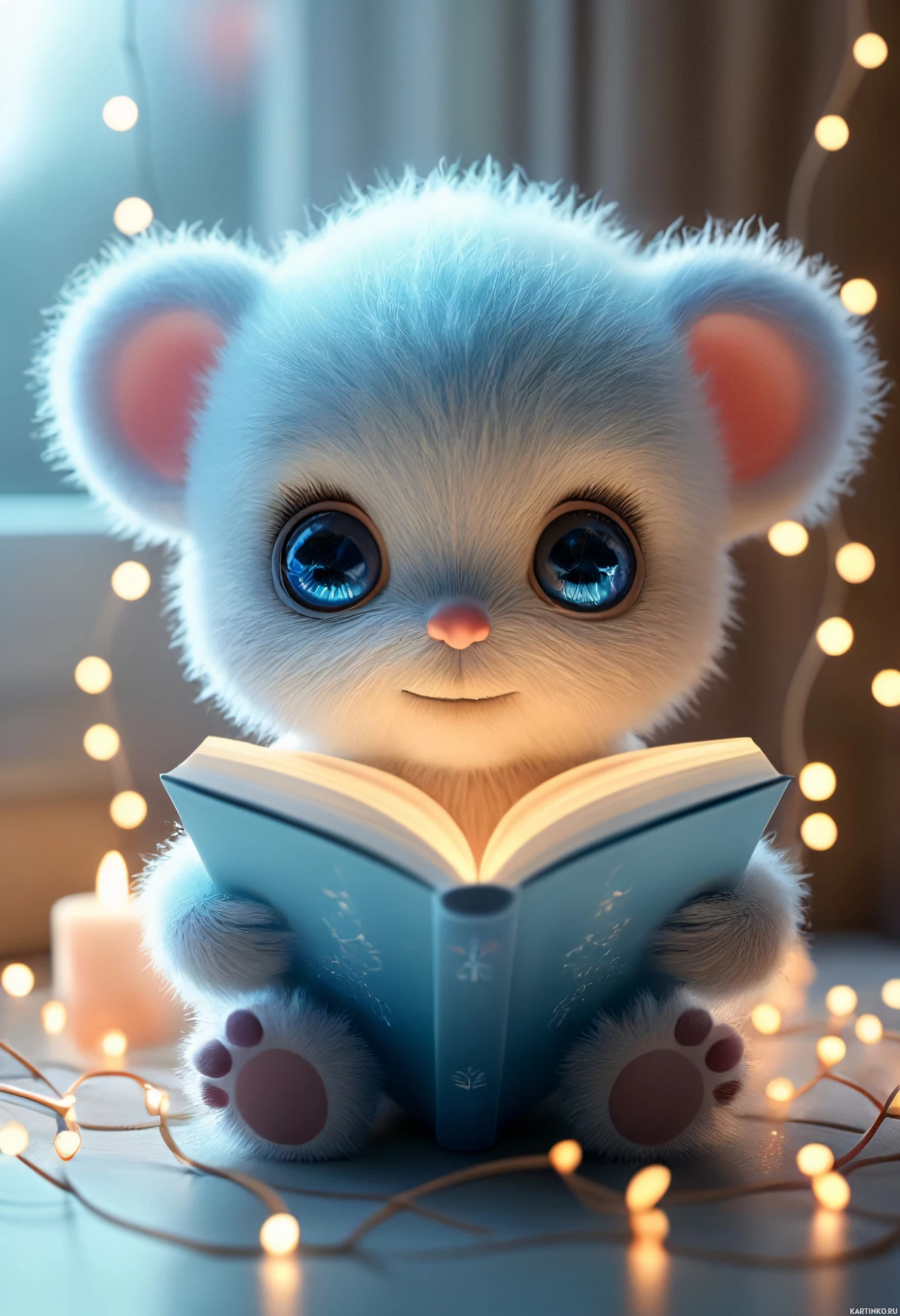 На картинке сидит мягкая игрушка в виде кота, на столе перед ним лежит книга. Кажется, он читает: лапки аккуратно лежат на страницах, словно держат их открытыми. Комната освещена приглушенным светом, сквозь окно пробивается свет свечи, создавая теплую атмосферу. На заднем плане – гирлянда огней, добавляющая уюту. У кота голубая шерсть с белыми отметинами на мордочке и лапках.