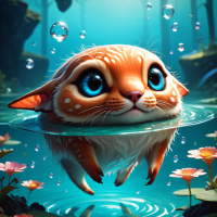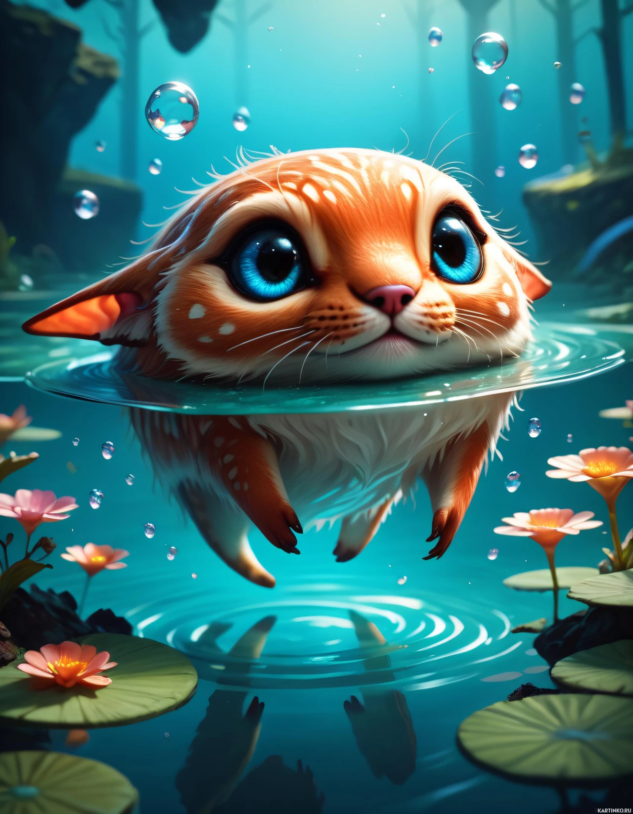 На картинке – небольшое животное, похожее на кошку с окрасом, характерным для лисиц. Кошка плывет в воде и спокойно смотрит вверх. Вода покрыта пузырьками и освещена, кажется, подводным источником света, создающим мягкое сияние на поверхности. Вокруг воды – камни, напоминающие грибы своей формой. На переднем плане плавают цветы. На заднем плане видны деревья, окутанные дымкой, что придает картине таинственную атмосферу.