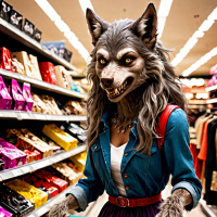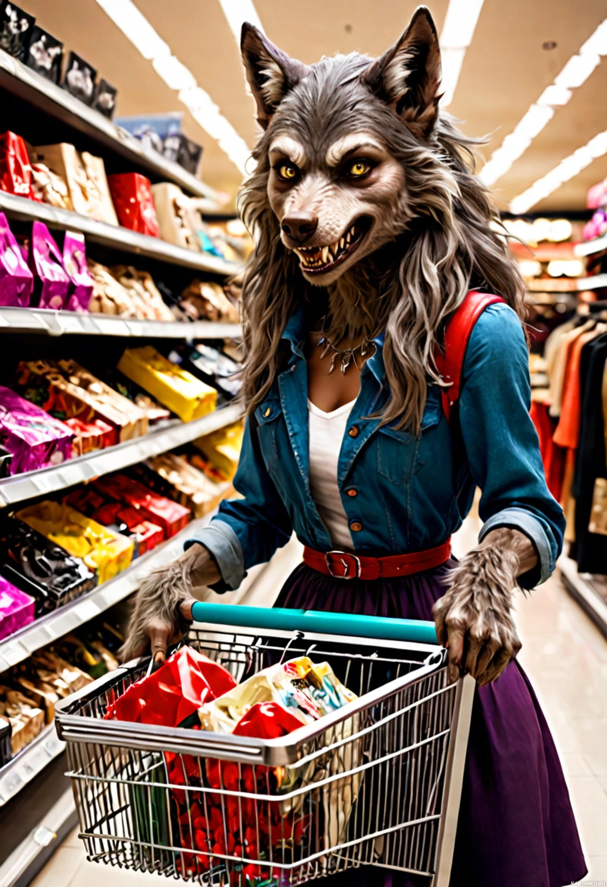 На картинке изображена женщина, делающая покупки в магазине, похожем на супермаркет. У неё длинные седые волосы, она одета в джинсовую рубашку с красным поясом, юбку и коричневые ботинки. На переднем плане тележка, наполненная различными коробками с продуктами. На заднем плане видны ряды полок с бисквитами и хлопьями. На её лице – маска или костюм оборотня с огромным рылом и заострёнными ушами. Она смотрит вниз на содержимое тележки с бесстрастным выражением лица.