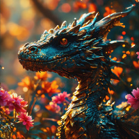 The image depicts a fantasy creature that resembles a dragon. It has prominent horns, scales with a metallic blue hue, and intricate patterns along its body. The dragon's eyes are glowing red, suggesting it may be in an alert or enchanted state. Its expression appears serene as it gazes towards the viewer, and there is a soft light that bathes the scene, giving it a magical atmosphere. In the background, there is a lush environment with pink flowers blooming amidst green foliage, contributing to the mythical and fairy-tale quality of the artwork.