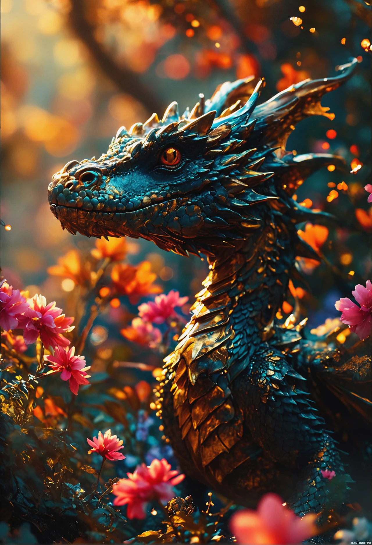 Картинка изображает фантастическое существо, похожее на дракона. У него заметные рога, чешуя с металлическим синим отливом и замысловатые узоры на теле. Глаза дракона ярко-красные, что говорит о его настороженности или зачарованности. Выражение его лица спокойное, он смотрит на зрителя, а мягкий свет окутывает сцену, создавая волшебную атмосферу. На заднем плане — пышная местность с розовыми цветами, распустившимися среди зелени, что придает произведению искусства сказочный и мифический характер.