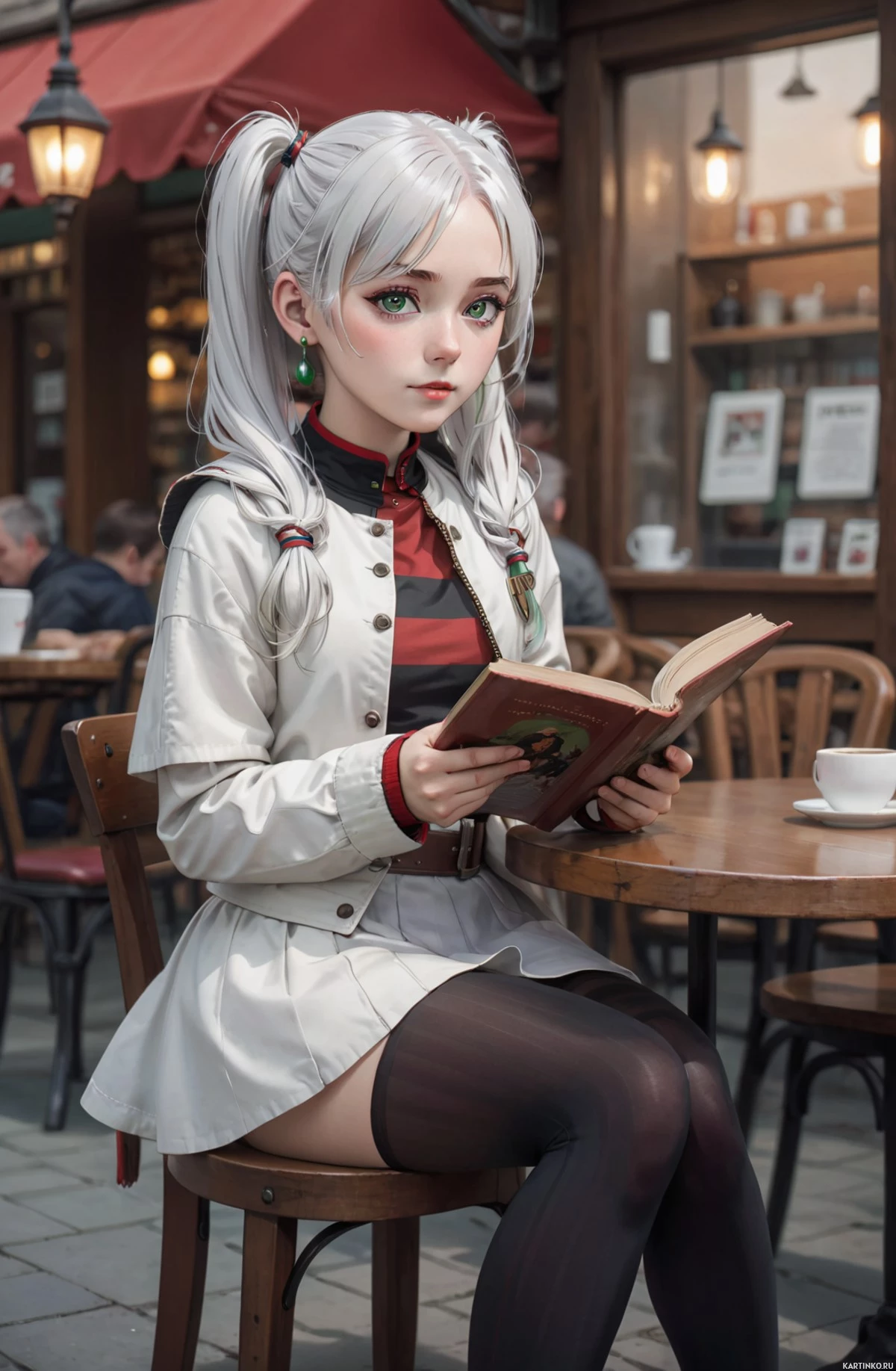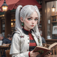 outdoor table, engrossed in her book. The character is wearing a military-style jacket over a red top, paired with
