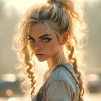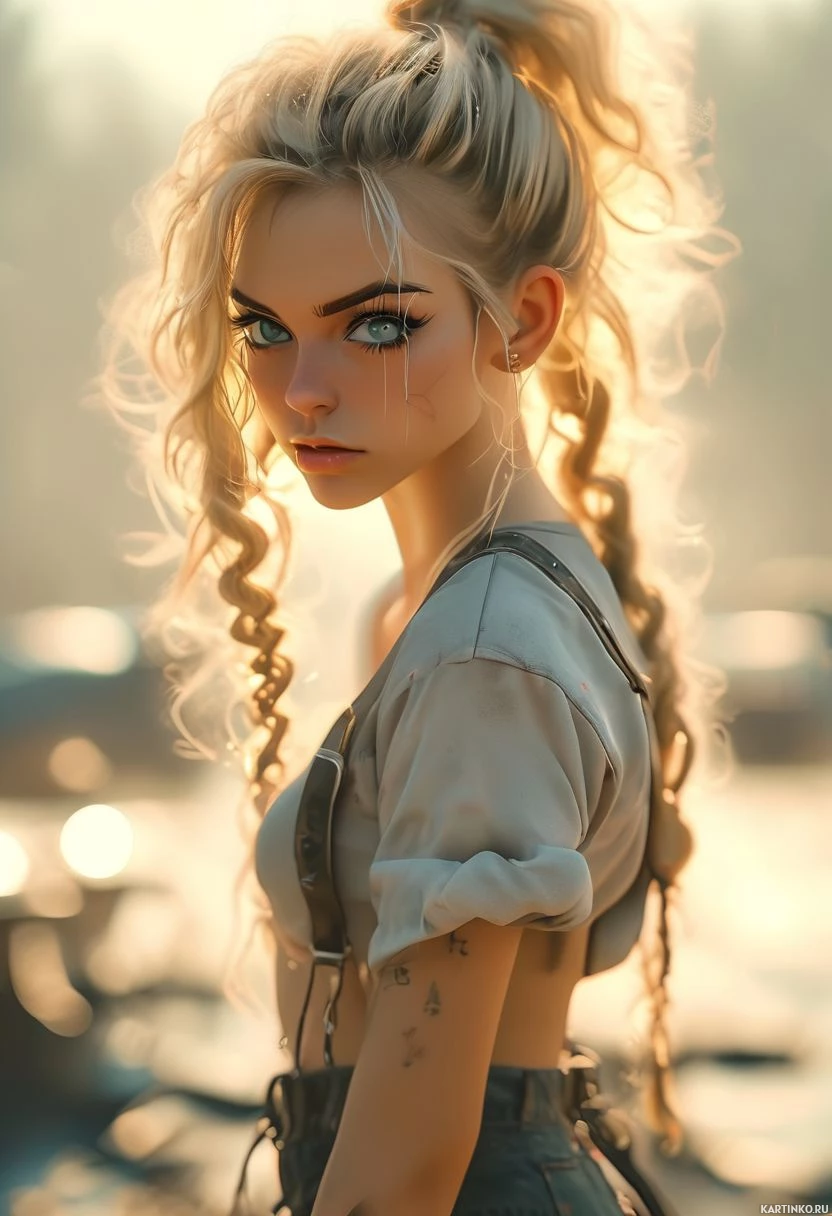 На картинке запечатлена молодая женщина с светлыми волосами в профиль. У неё чёлка и распущенные волнистые волосы, небрежно спадающие на одно плечо. Макияж включает тёмную подводку для глаз и лёгкий контуринг, придающий ей ухоженный, но естественный вид. Освещение говорит о том, что наступил поздний полдень или ранняя вечерняя пора, поскольку солнечный свет отбрасывает длинные тени на лицо и дарит тёплое сияние обстановке. На ней светлая блуза с открытыми плечами, слегка приоткрывающая зону декольте. Правая рука небрежно лежит на бедре, а левая свободно свисает вдоль тела. На заднем плане, похоже, пляж или каменистый берег, где солнечный свет отражается, создавая драматический эффект.