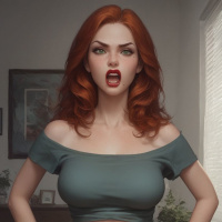 The image shows a woman standing indoors with her hands on her hips. She has shoulder-length red hair and is wearing a gray top with short sleeves. Her pose suggests confidence, and she is looking directly at the camera. There's a blurred background that indicates an interior setting, possibly a room with domestic elements like furniture. The photo is taken from a slightly angled perspective, giving a sense of depth to the composition.